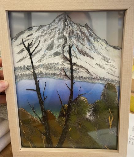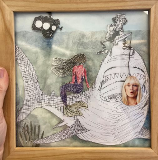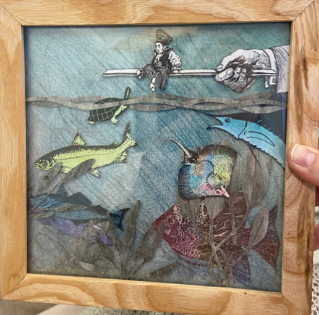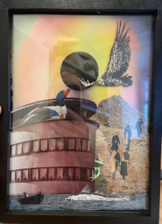 Die hier vorgestellten Arbeiten sind eine Kombination aus einer Collage, die aus eigenen Zeichnungselementen, Papierschnipseln und ausgeschnittenen Druckelementen bestehen und aus einem selbstgemachten Holzrahmen mit Plexiglasplatten, zwischen denen die einzelnen Objekte der Collage geschichtet wurden. Dadurch ergibt sich ein interessantes dreidimensionales Bild.