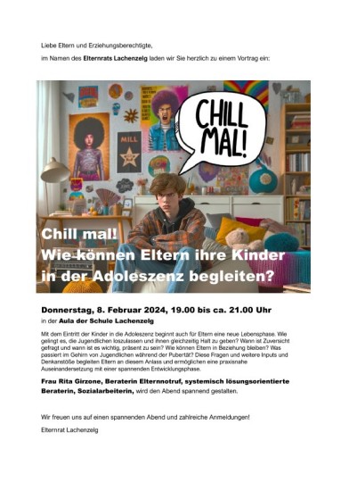 Am 8. Februar 2024 findet in der Aula der Schule Lachenzelg die Veranstaltung "Chill Mal" in Zusammenarbeit mit dem Elternnotruf statt. Frau Rita Girzone spricht über Jugendliche in der Adoleszenz und wie Eltern ihre Kinder in dieser Phase am besten unterstützen können. Was passiert dabei im Gehirn? Wie bleibt man zusammen in Beziehung? Dies und viele weitere Themen werden angesprochen und anhand von vielen Inputs und Denkanstössen präsentiert. Organisiert wird der Anlass vom Elternrat der Schule Lachenzelg.
