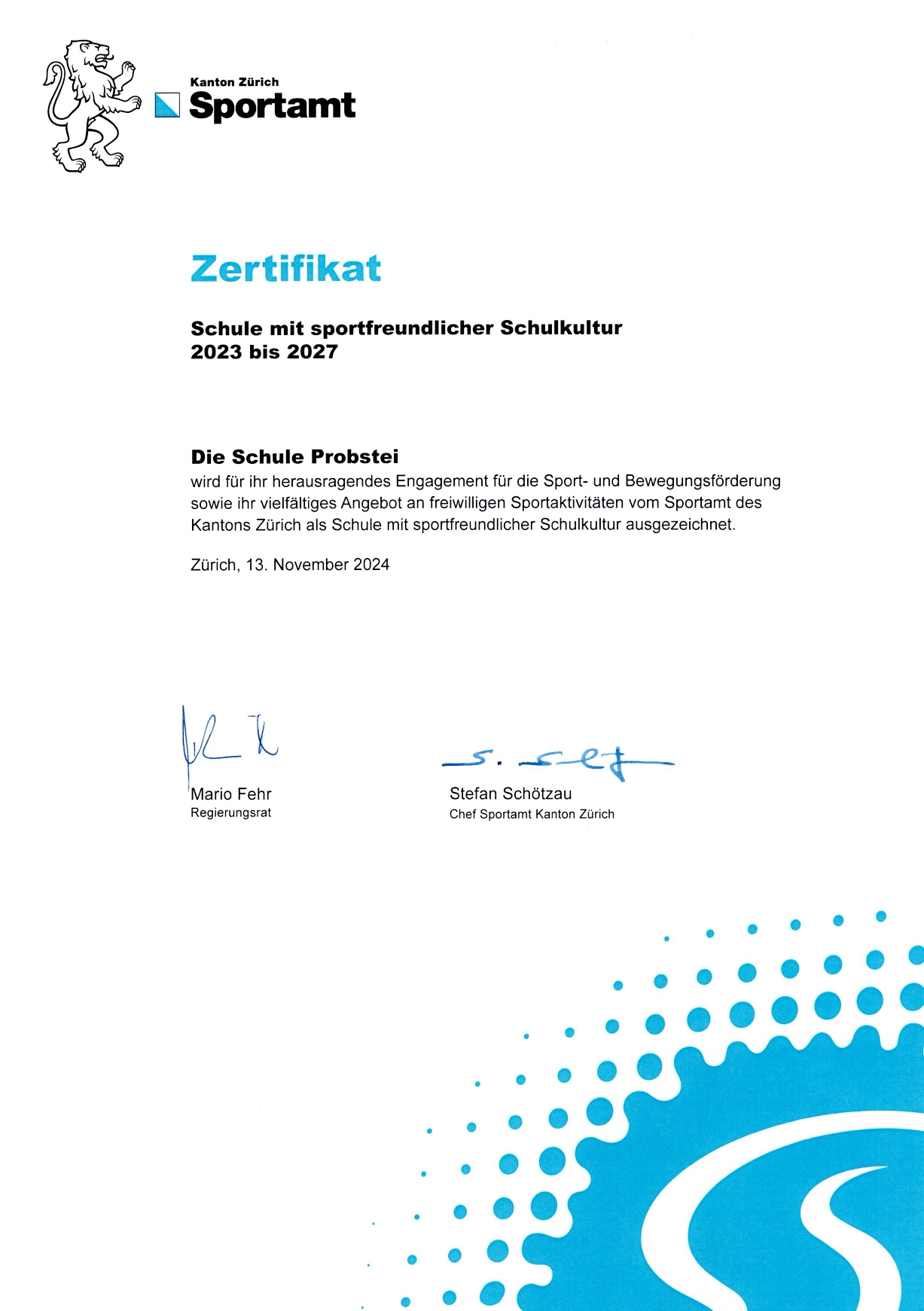 Unsere Schule wurde vom Sportamt des Kantons Zürich für seine sportfreundliche Schulkultur mit diesem Zertifikat ausgezeichnet
