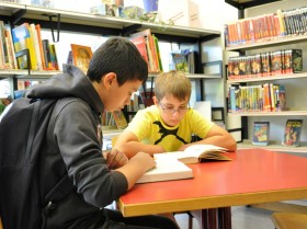 Zehn interessierte Mittelstufenkinder gehören zum Bibliotheksteam. Sie übernehmen die Rücknahme und Neuausleihe in den Zehnuhrpausen.