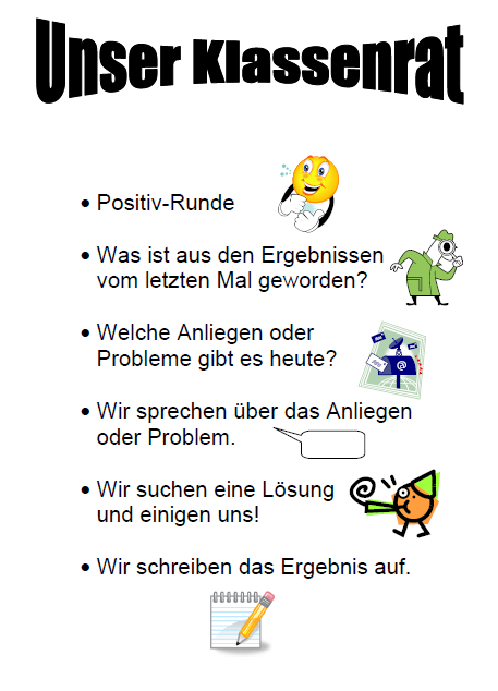 Der Klassenrat ist ein fester Bestandteil im Schulleben. Er bietet eine erstklassige Möglichkeit, wie Kinder und Jugendliche kontinuierlich ihr Schulleben mitgestalten und dabei demokratische Verhaltensweisen einüben, ihre Klassengemeinschaft verbessern und zugleich Lehrplanziele erreichen können.