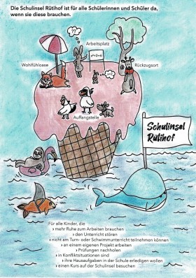 Unsere Schulinsel erfüllt verschiedene Aufgaben. Kinder, die den Unterricht stören, können von den Lehrpersonen auf die Schulinsel geschickt werden. Somit werden die Klasse und die Lehrperson entlastet und das störende Kind erhält die zusätzliche Aufmerksamkeit, ohne den Unterricht und das Klassenklima allzu sehr zu belasten.