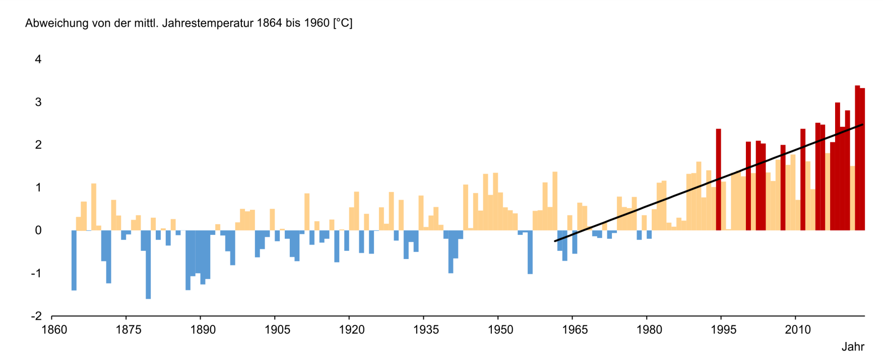 Seit 1980 lag die mittlere Jahrestemperatur ausnahmslos über der langjährigen mittleren Temperatur zwischen 1864 und 1960 – Jahrestemperaturen unter dem langjährigen Schnitt wurden keine mehr verzeichnet. In der Hälfte der letzten 25 Jahre wurden Abweichungen der Jahrestemperatur zum langjährigen Mittel von über 2 Grad Celsius gemessen