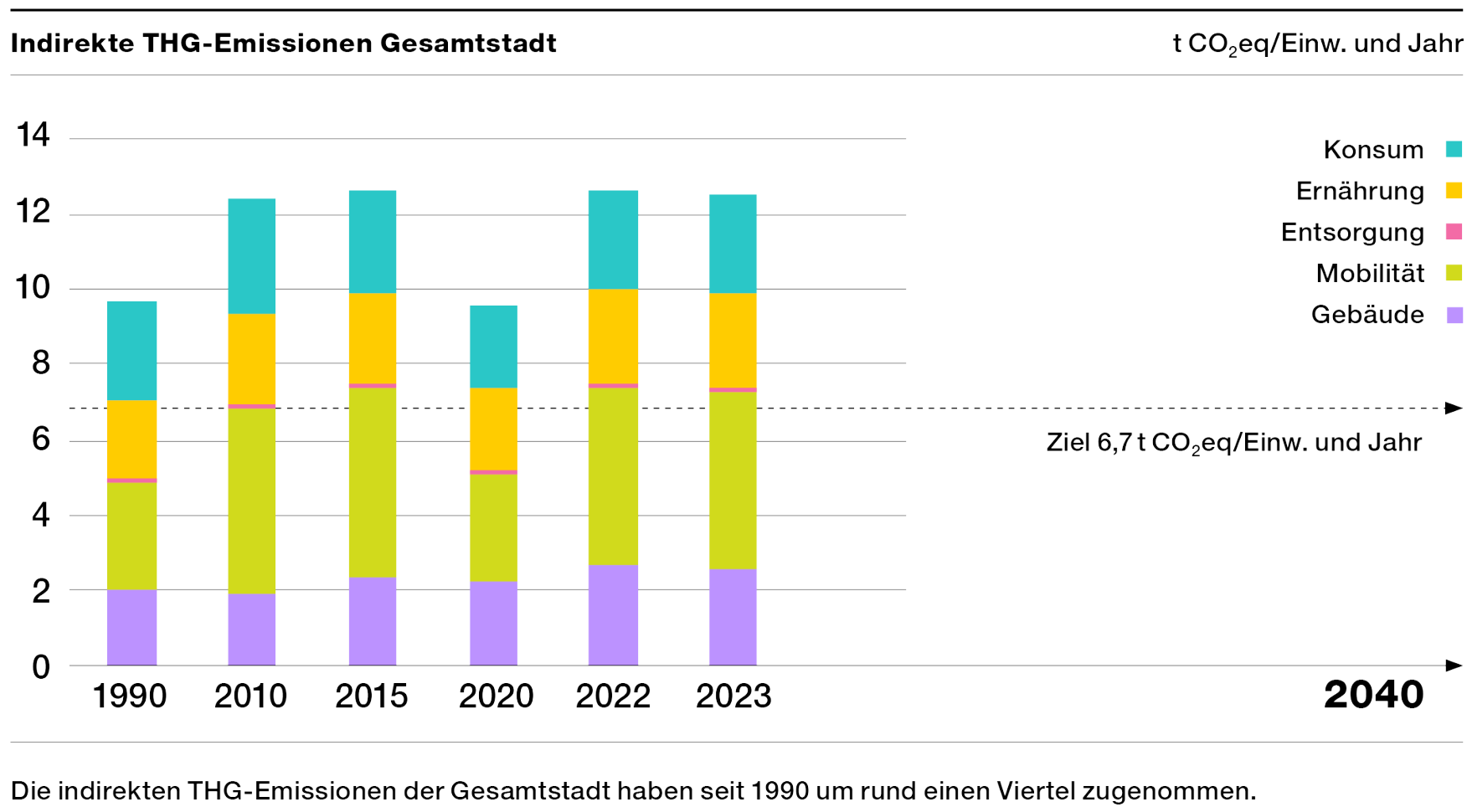 Neben den auf dem Stadtgebiet ausgestossenen Treibhausgasen werden in der Treibhausgasbilanz der Gesamtstadt erstmals auch die indirekten Emissionen detailliert ausgewiesen für die Jahre 1990 (Jahr für Zielfestlegung), 2010, 2015, 2020, 2022 (Referenzjahr des Absenkpfads) und 2023. Die indirekten THG-Emissionen haben seit 1990 zugenommen, die Klimaschutzziele sind deshalb eine grosse Herausforderung für alle. Um die Emissionen im Vergleich zu 1990 um 30 % zu senken, müssen sie gegenwärtig ungefähr halbiert werden. In der Gesamtstadt lässt sich die Zunahme insbesondere auf mehr Flugreisen und die gestiegene Bautätigkeit zurückführen.
