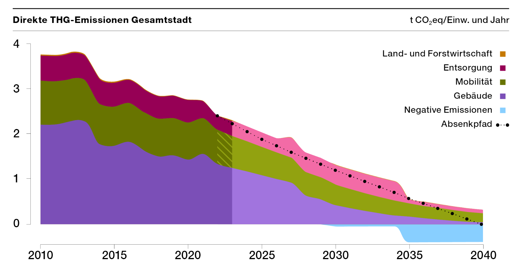 Die zukünftigen direkten Emissionen der Gesamtstadt bis 2040 wurden basierend auf sechs Massnahmenpaketen, die auf Zielen städtischer Strategien und Planungen basieren, modelliert. Die Abschätzung der zukünftigen Treibhausgasemissionen zeigt, dass das Netto-Null-Ziel für die direkten Treibhausgasemissionen auf Stadtgebiet bis 2040 ambitioniert, aber realistisch ist. Damit das Netto-Null-Ziel für die Gesamtstadt bis 2040 erreicht wird, braucht es vor allem auch klimafreundliches Handeln der Stadtbevölkerung und der Unternehmen. Die Massnahmen der Stadtverwaltung erleichtern und ermöglichen es ihnen, die Emissionen in ihrem Verantwortungsbereich zu senken.