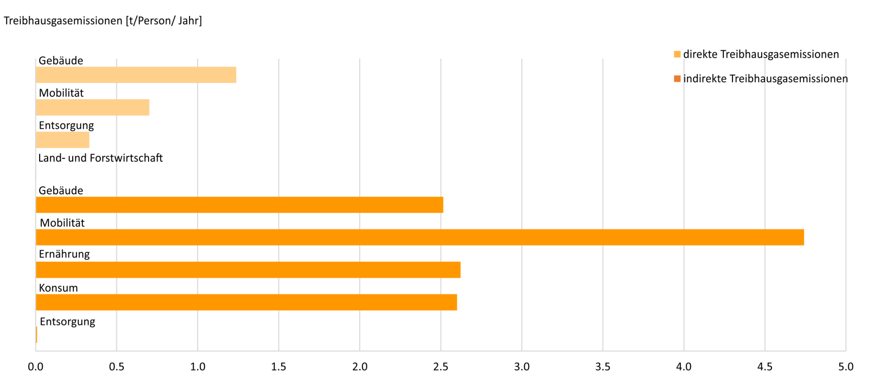 Aktuell setzen Zürcher*innen etwa 2,3 Tonnen an direkten Treibhausgasemissionen pro Person und Jahr frei. Die direkten Emissionen entstehen auf dem Stadtgebiet, hauptsächlich durch die Nutzung fossiler Energieträger und die Entsorgung von Abfällen. Weitere 12,5 Tonnen CO2-Äquivalente pro Person und Jahr werden als indirekte Treibhausgasemissionen verursacht. Diese werden durch Stadtzürcher Aktivitäten (Gebäude- und Verkehrsinfrastruktur, Mobilität ausserhalb der Stadt inkl. Flugverkehr, Ernährung, Konsum, Energie-Vorketten) ausgelöst, aber ausserhalb der Stadtgrenze verursacht. Die indirekten Emissionen haben somit einen Anteil von 85% an den gesamten Treibhausgasemissionen der Stadt Zürich.
