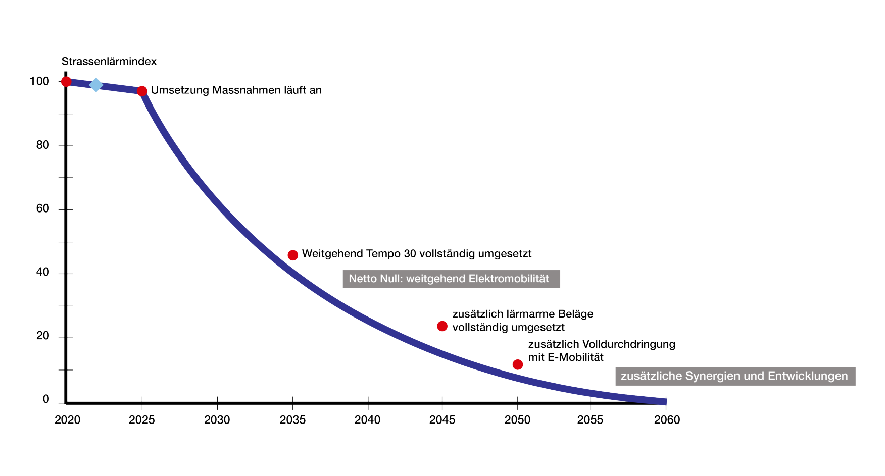 Eine Prognose des Strassenlärmindex zeigt auf, wie sich die Entlastung von Personen mit Lärmbelastungen über dem Immissionsgrenzwert mit der Zeit in der Stadt Zürich entwickeln soll. Die Prognose bildet die geplanten Lärmschutzmassnahmen und ihre kombinierte Wirkung ab. Zudem sind Synergiewirkungen mit weiteren Entwicklungen und Massnahmen berücksichtigt. Der Indexpunkt von 2022 liegt auf der Prognosekurve.