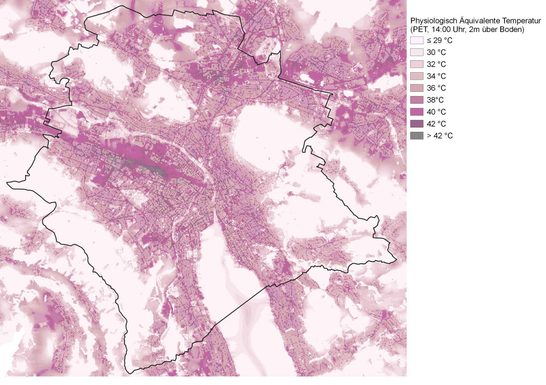 Innerhalb der Stadt entstehen je nach baulicher Dichte und Materialisierung unterschiedlich ausgeprägte Wärmeinseln. Besonders kritisch ist die Wärmebelastung in heissen Sommernächten, wenn es in Zentrumsgebieten um bis zu 7 °C wärmer werden kann als im städtischen Umland.