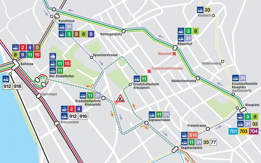 - Linien 11, S18, SN18: Richtung Rehalp wird die Haltestelle Kreuzplatz von den Trams und der Forchbahn nicht bedient. Bitte benutzen Sie die Haltestelle Signaustrasse.
