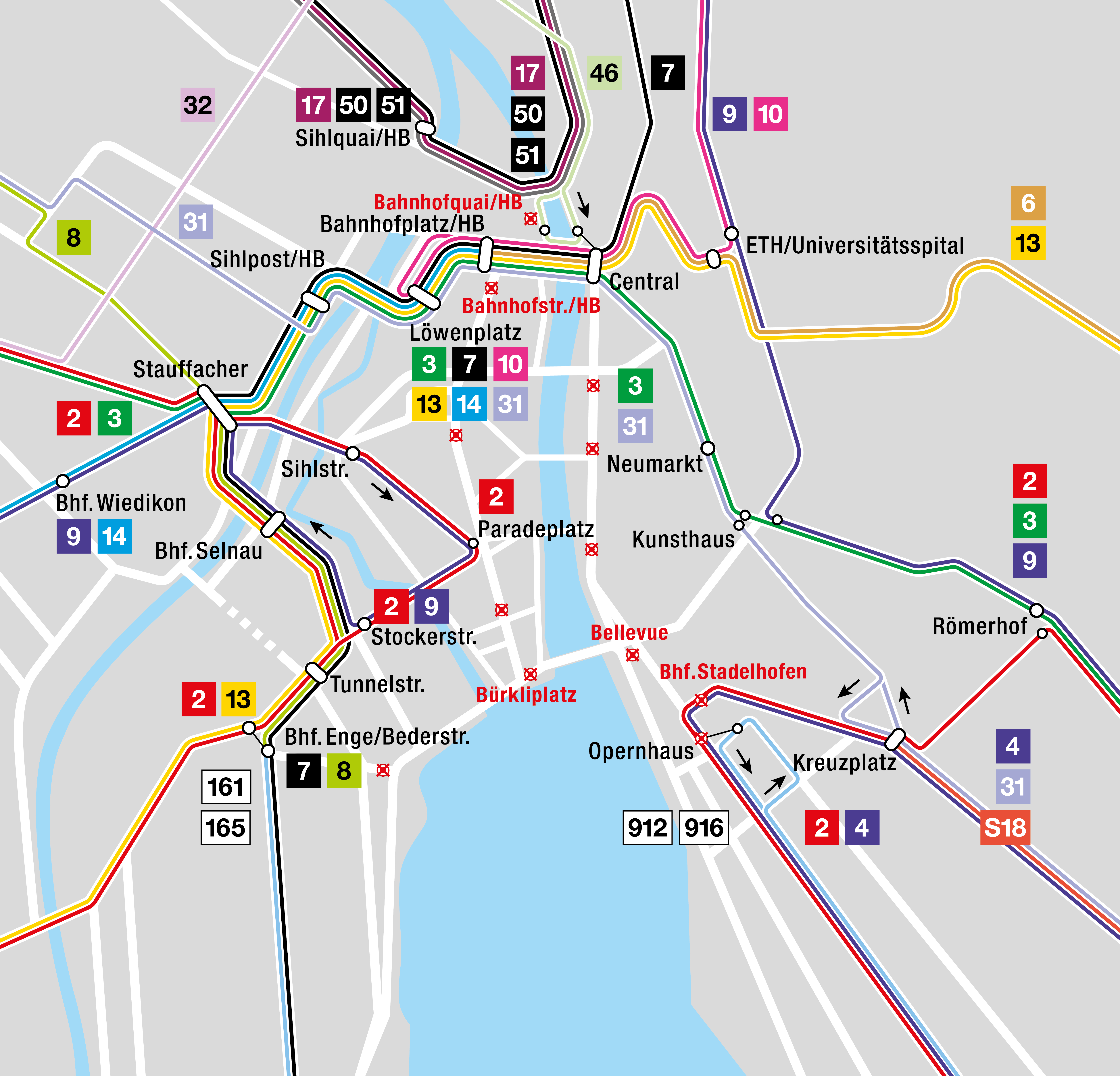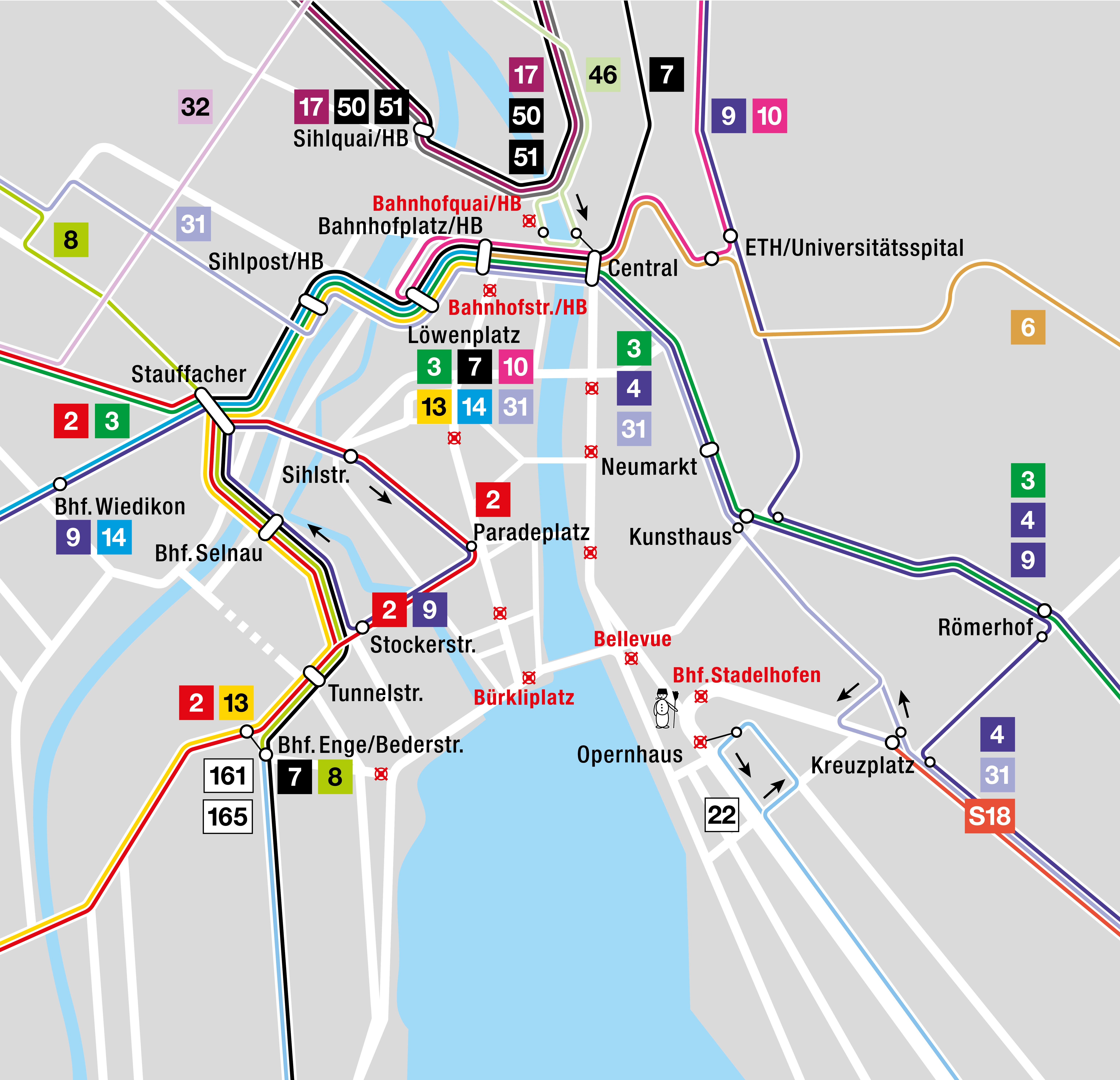 - Verbindungen: ab Bhf. Enge, Paradeplatz, Löwenplatz, Bahnhofplatz/HB, Central, Kunsthaus, Opernhaus, Kreuzplatz